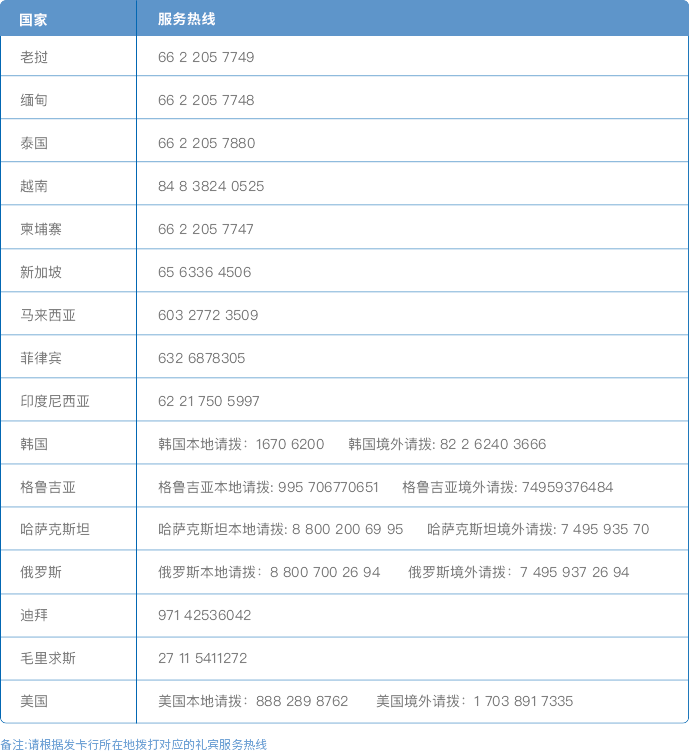 各國或地區禮賓服務熱線號碼