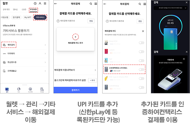 NFC방식으로 결제하는 HCE(Host Card Emulation)나 아이폰, 삼성 등 휴대폰의 전자 월렛에서 유니온페이 카드를 등록하면 유니온페이 모바일 결제가 사용 가능합니다.